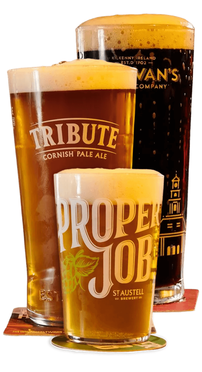 Tribute Pale Ale, Proper Job, Big Job Double IPA, Mena DHU Cornish Stout, Hicks Strong Ale and Kdrev Lager.